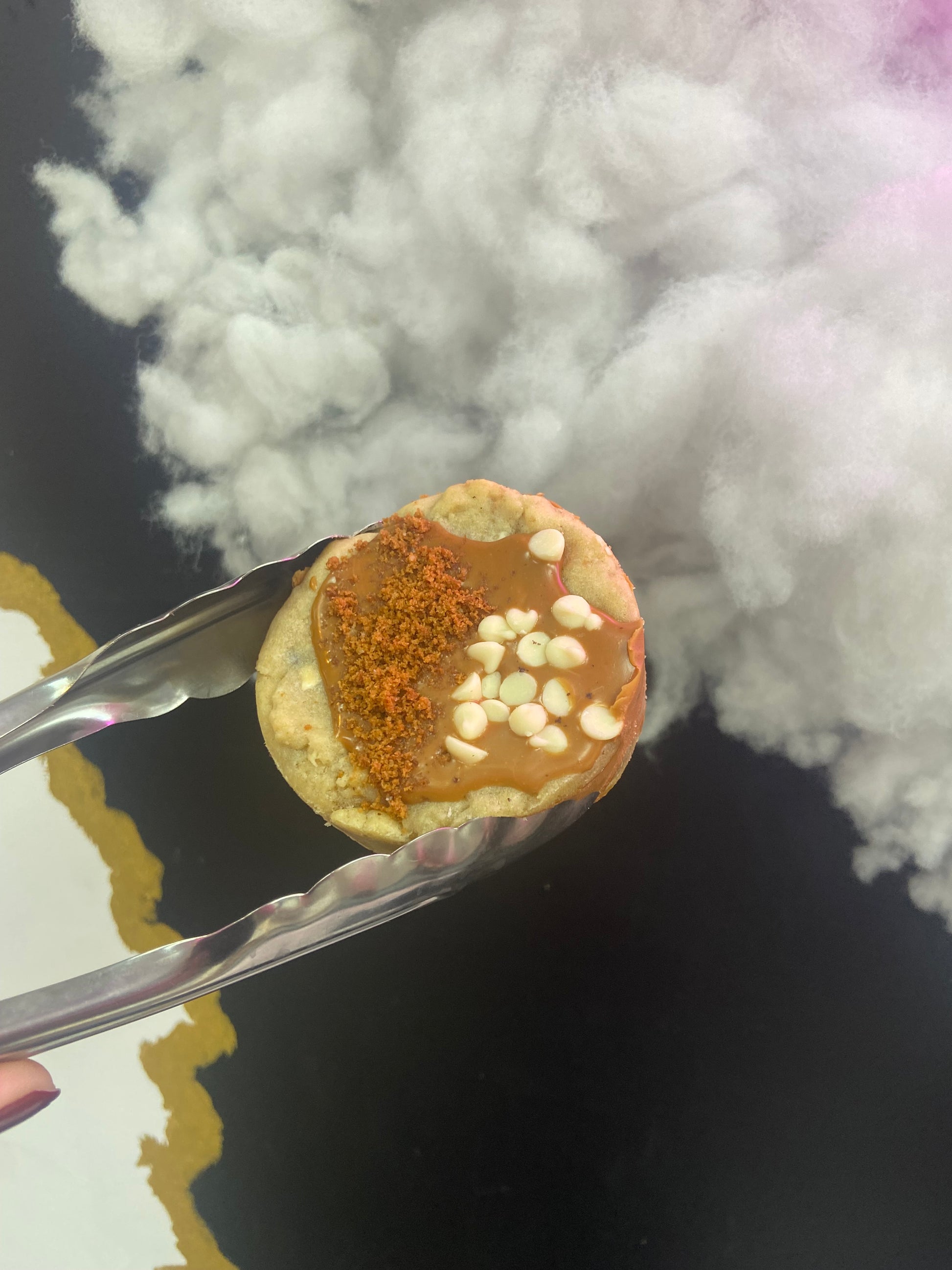Lotus Biscoff sauce in a chocolate chunk cookie deep dish crust, topped with Lotus Biscoff, Speculoos crumb and white chocolate chips.